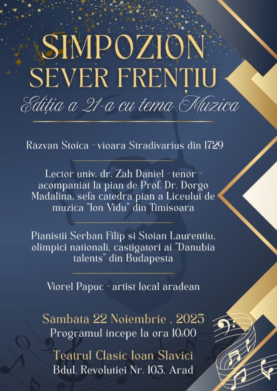 Tot în 22 noiembrie, de la ora 10:00, Aradul găzduiește Simpozionul „Sever Frențiu”, ajuns la cea de-a XXI-a ediție. Evenimentul aduce în prim-plan tema muzicii, reunind artiști consacrați și tineri talentați într-un program de excepție.