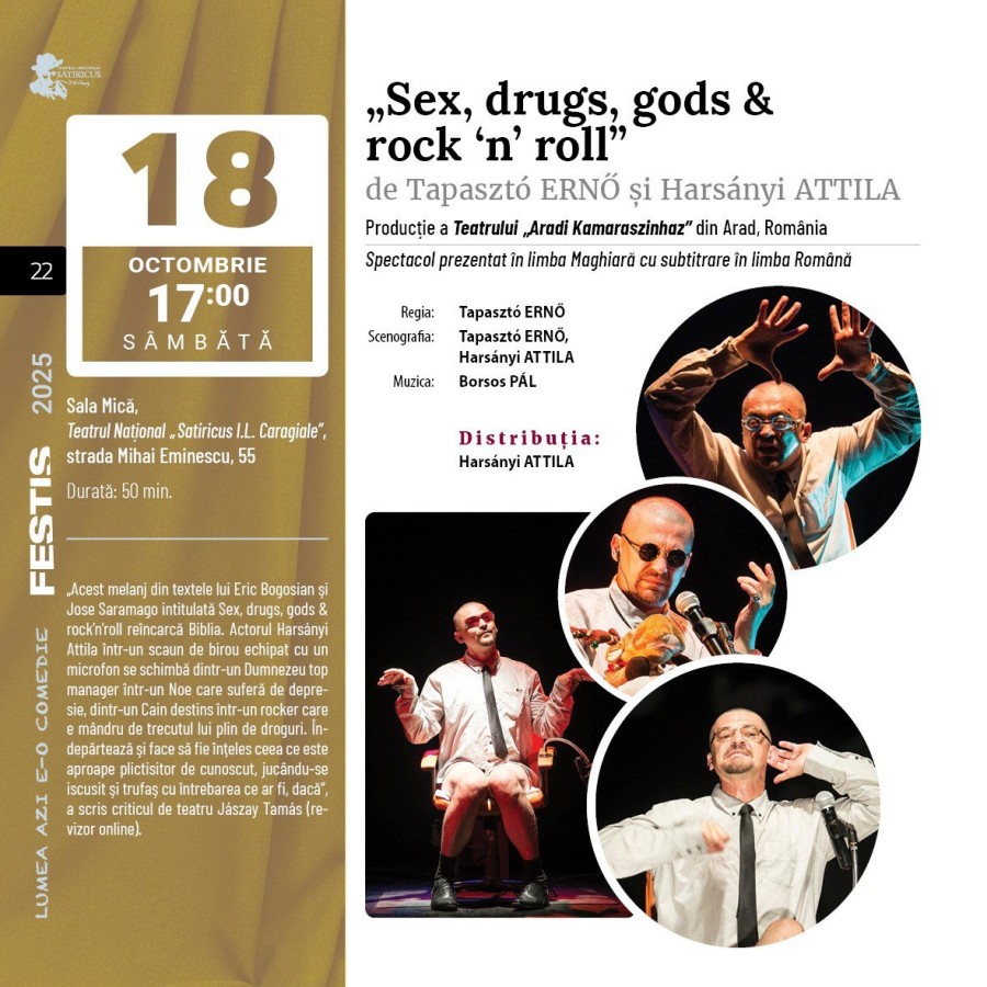 Pe 18 octombrie, la ora 17:00, în programul festivalului este inclus spectacolul „Sex, drugs, gods and rock’n’roll”, o „tragedie radicală de tip stand-up”. Actorul Attila Harsányi interpretează acest spectacol bazat pe texte de Eric Bogosian și José Saramago, în regia lui Ernő Tapasztó, directorul Companiei de Teatru Aradi Kamaraszínház. Monodrama conturează o imagine înfricoșător de familiară a umanității, printr-o abstractizare absurdă, cu fragmente de umor și o sinceritate brutală. Decorul minimal include un singur scaun pivotant cu un microfon prins de brațul său și un mic suport cu câteva perechi de ochelari. Pe scaun, Attila Harsányi poartă doar o cămașă, fără pantaloni, în șosete și pantofi de lac negri. Actorul joacă acest spectacol încă din 2014, fiind o coproducție între Compania de Teatru Aradi Kamaraszínház, Asociația MASZK din Szeged și Bakelit Multi Art Center.