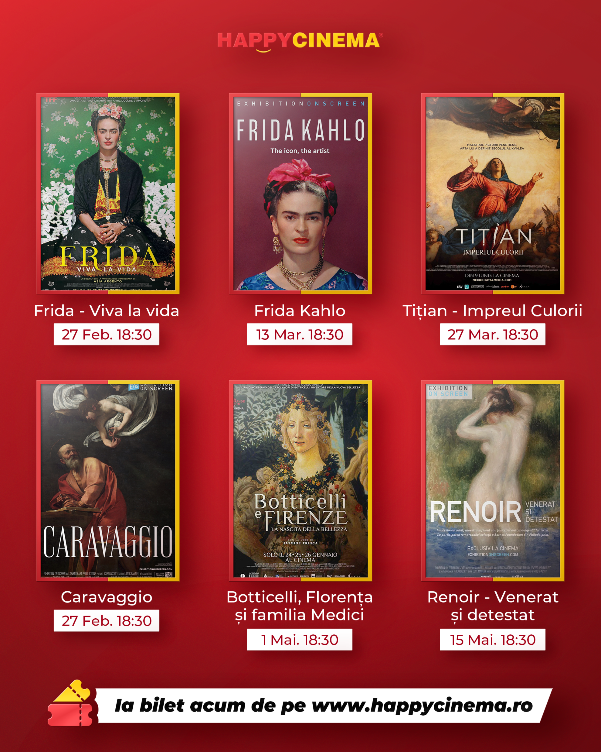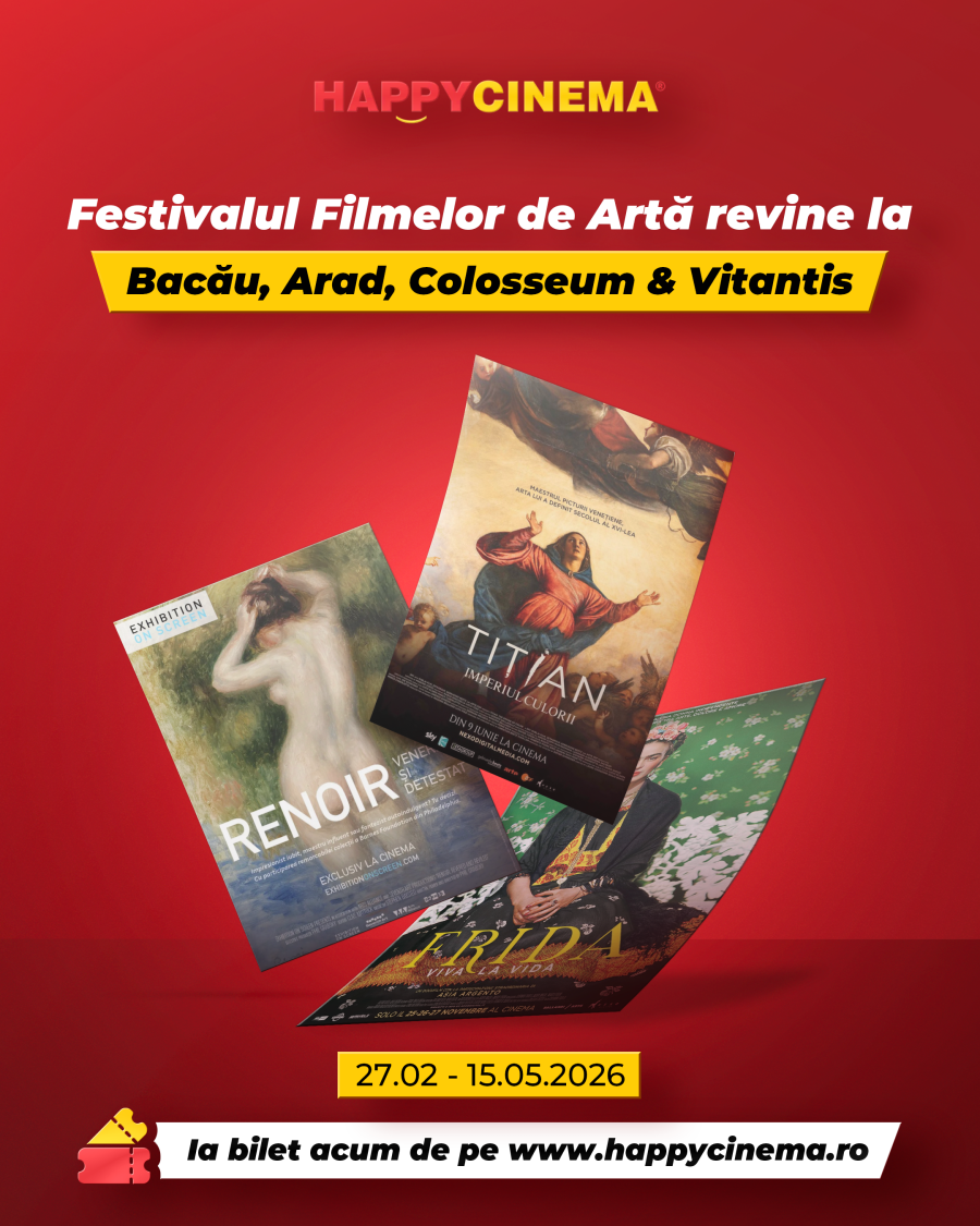 Happy Cinema aduce în Arad un nou capitol dedicat iubitorilor de artă vizuală și cultură prin Festivalul Filmelor de Artă, o selecție de documentare spectaculoase despre unii dintre cei mai mari artiști ai lumii. Între 27 februarie și 15 mai 2026, la cinematograful Happy Cinema din Agora Mall, publicul are ocazia să descopere povești fascinante despre viață, creație și misterele din spatele capodoperelor care au schimbat istoria artei. Festivalul propune o experiență cinematografică diferită, în care filmul devine o punte către muzee, ateliere, orașe istorice și universul intim al marilor maeștri. Astfel, publicul poate urmări documentare despre nume care și-au lăsat amprenta asupra istoriei artei, precum Frida Kahlo, Tizian, Caravaggio, Renoir și mulți alții.