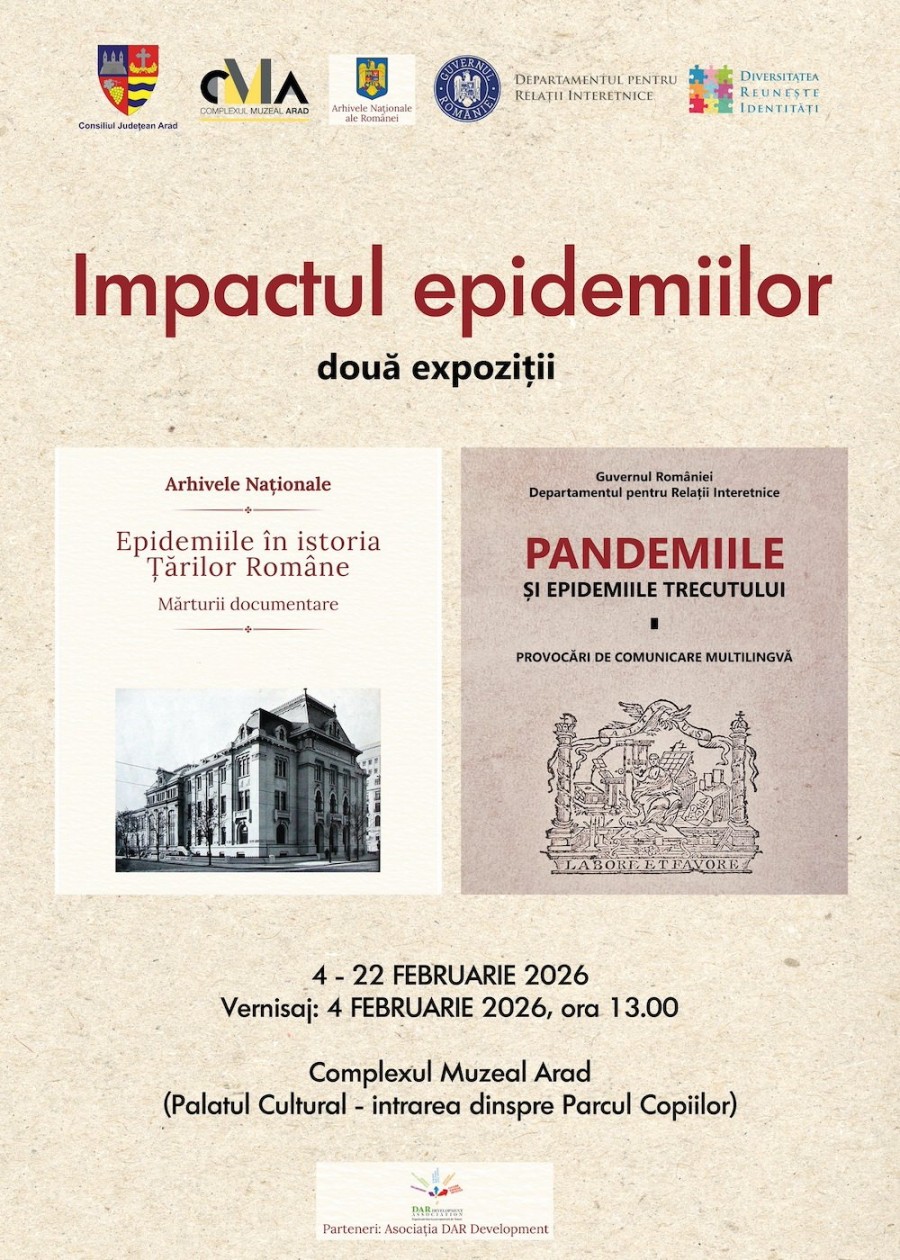Complexul Muzeal Arad, în parteneriat cu Arhivele Naționale ale României și Asociația Dar Development, cu sprijinul Departamentului pentru Relații Interetnice (DRI) din cadrul Secretariatului General al Guvernului, organizează două expoziții tematice dedicate impactului epidemiilor: „Epidemiile în istoria Țărilor Române. Mărturii documentare” și „Pandemiile și epidemiile trecutului. Provocări de comunicare multilingvă”.