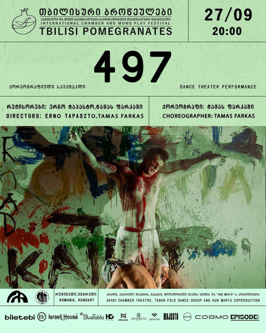 Pe 27 septembrie, spectacolul de teatru-dans intitulat 497, coproducție a Companiei „Aradi Kamaraszínház” și a Ansamblului de Dans Popular Tabán din Békéscsaba, va fi prezentat în cadrul unui prestigios festival internațional de teatru desfășurat în Tbilisi, capitala Georgiei. Festivalul Internațional de Teatru Pomegranates din Tbilisi are loc în perioada 25–28 septembrie.